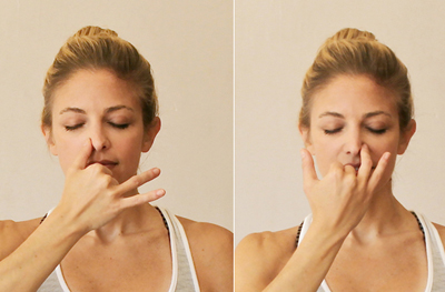 Take a deep breath in, and exhale through the nose in short, sharp breaths, pumping the diaphragm as you count to 50. Take a deep breath in and out. Repeat. You can do this in a seated position, such as lotus, where you are seated with your legs crossed, or while holding other positions.