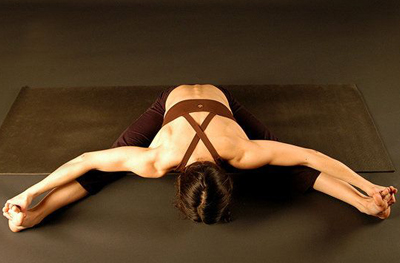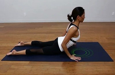 Lie on your stomach, feet together and pointed to the back of the room. Place your hands alongside your ribs for stability, press your pelvis into the mat, and use your back muscles to lift your chest off the mat. Gaze just six inches in front of you to keep from crunching your cervical spine in your neck. Try lifting your hands off of the mat to lift higher. Lower slowly.
